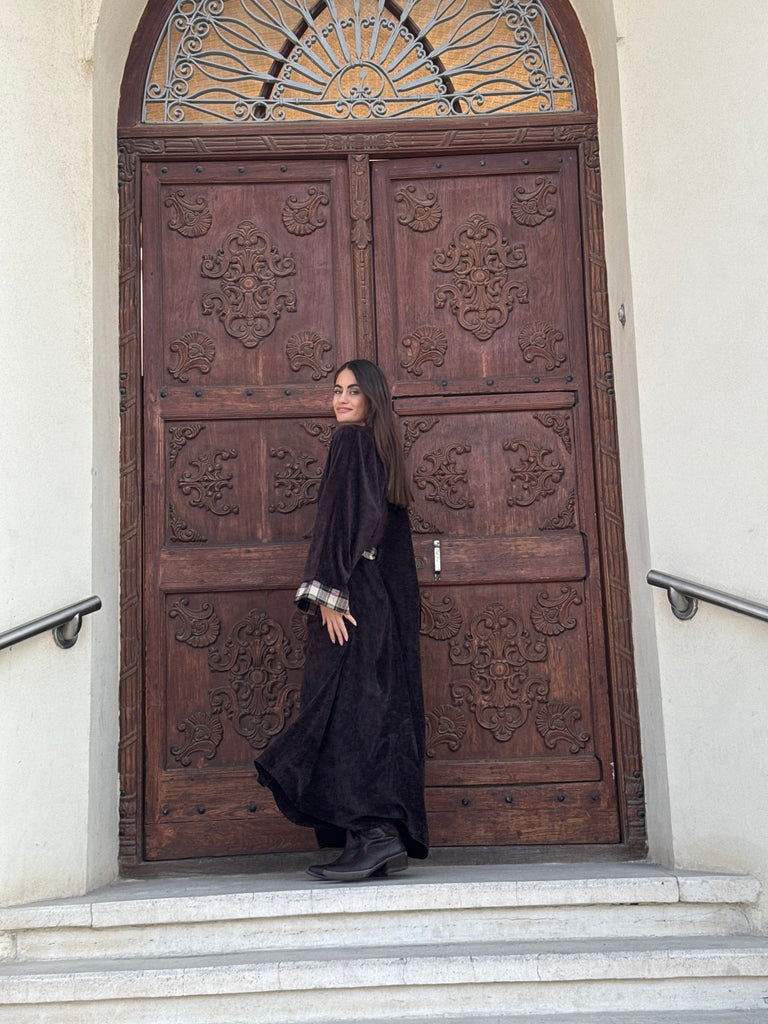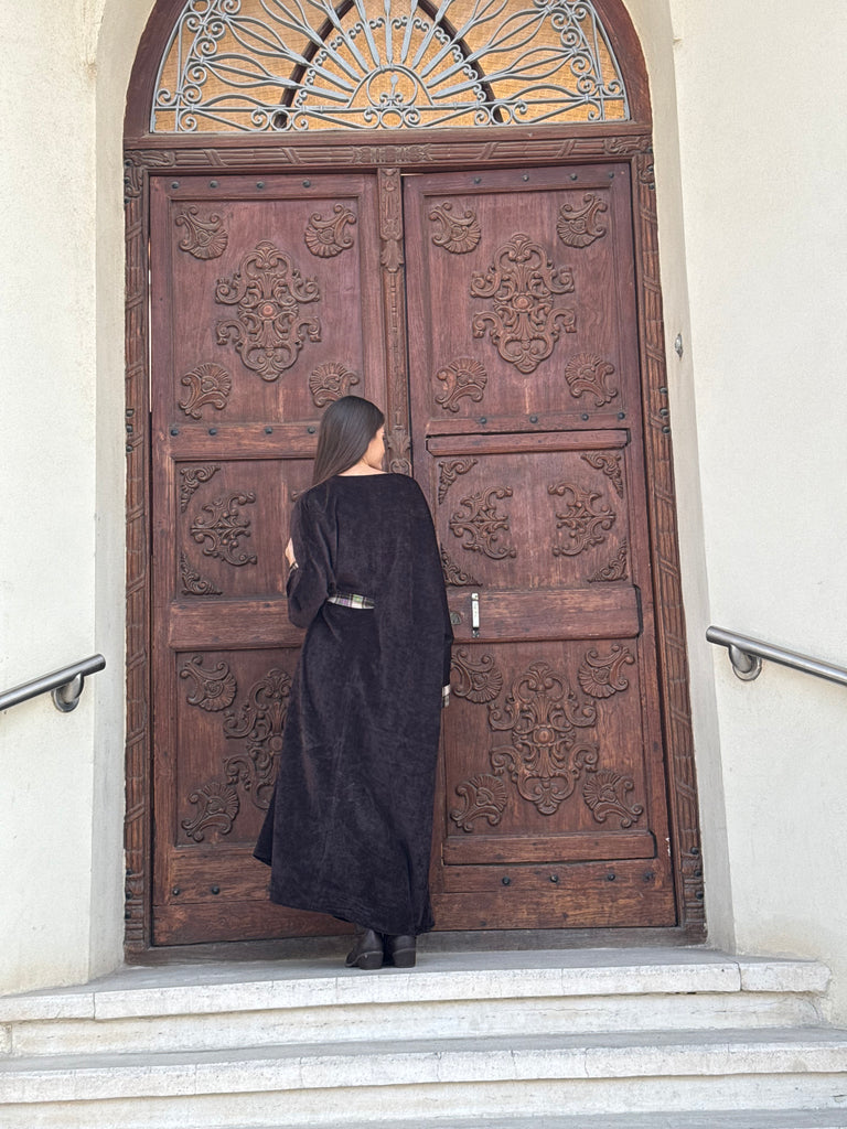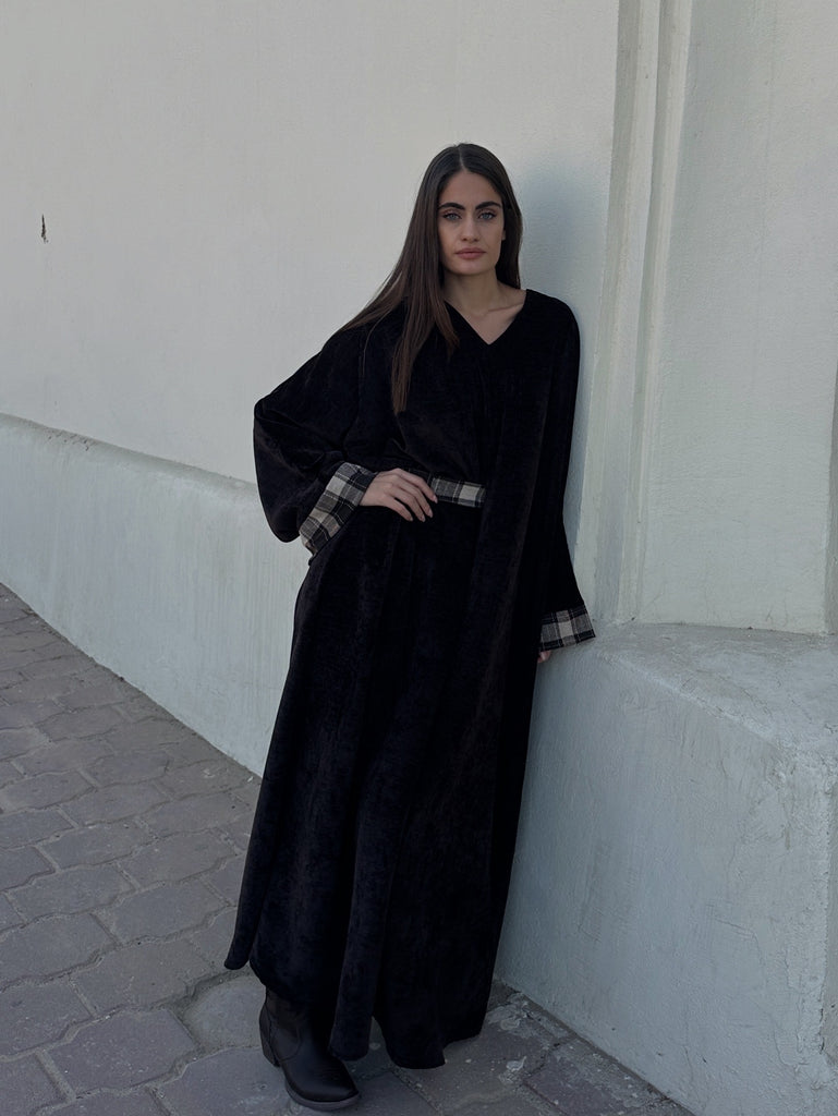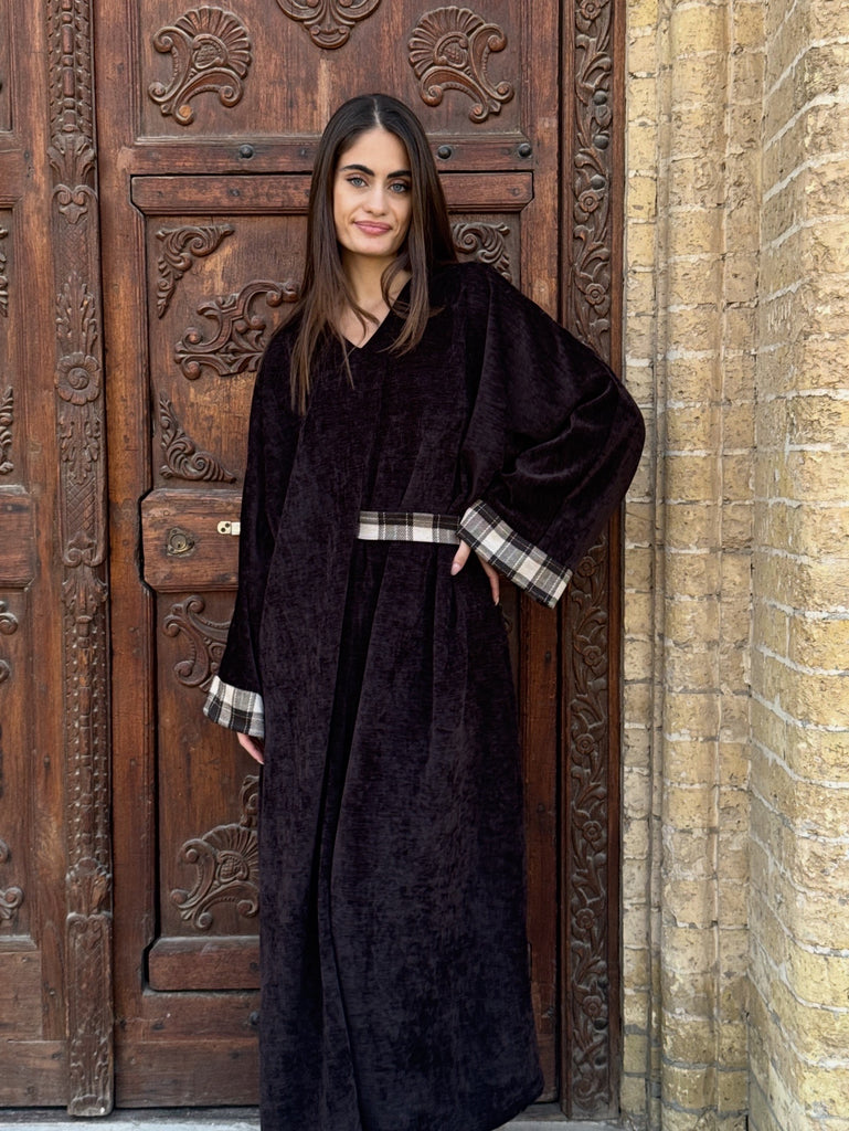 Flowy kaftan with plaid embroidery. Half belted. Full length.