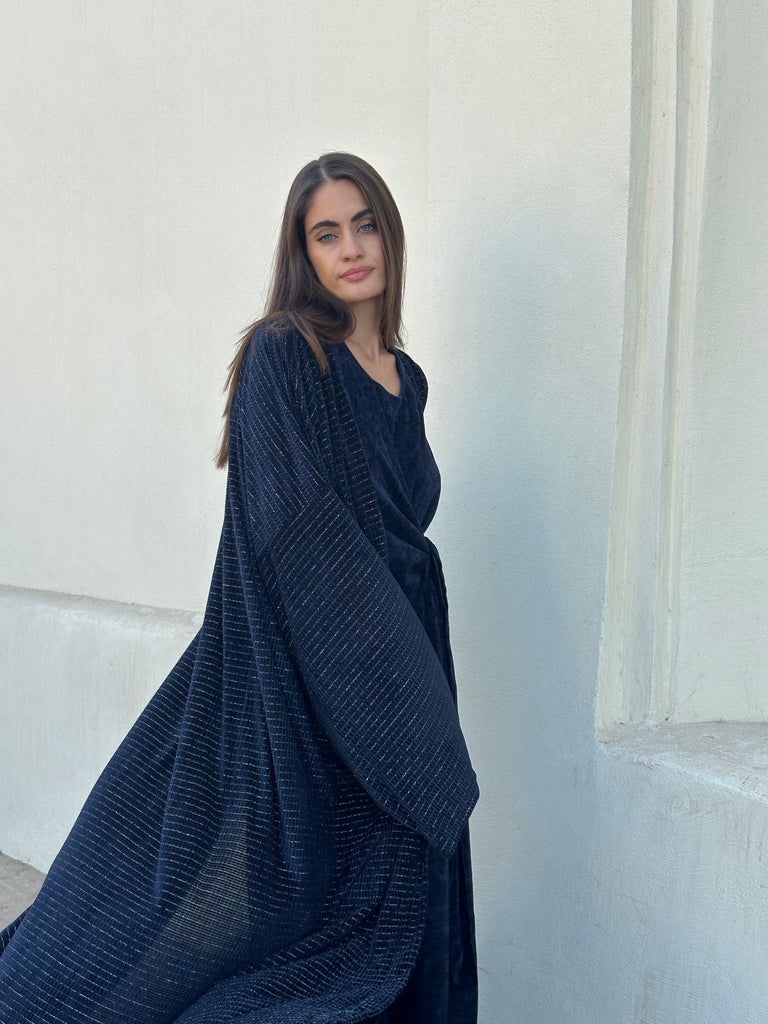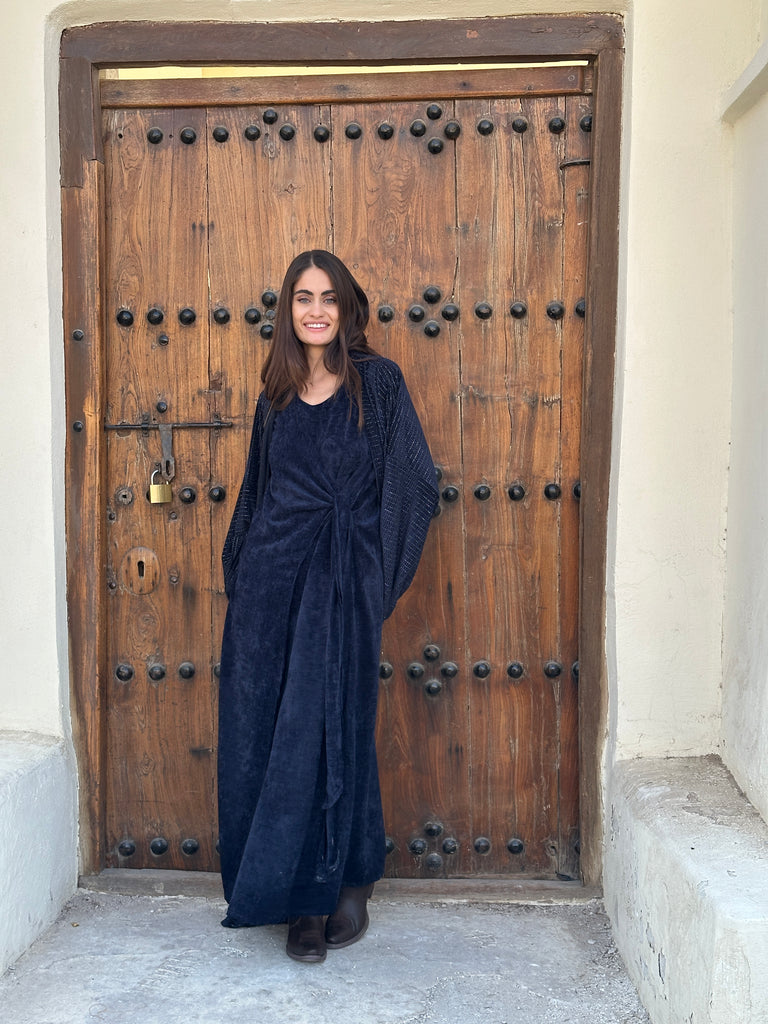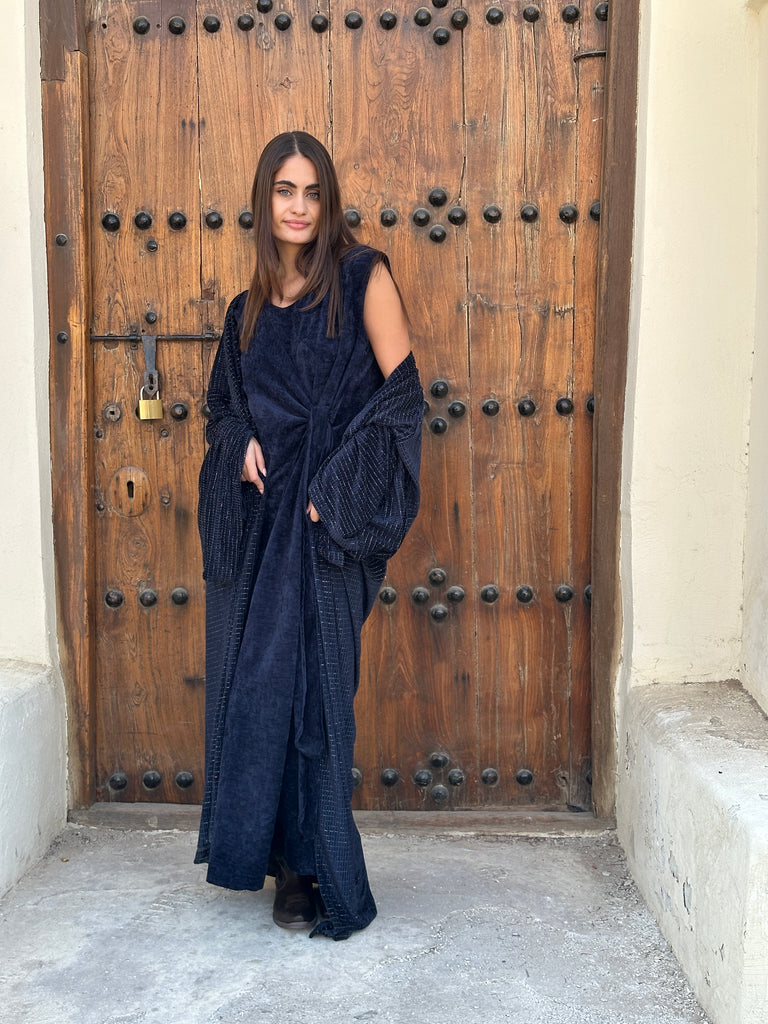 2 piece set includes a dress with adjustable belt and bisht. Free size. Length is 55".