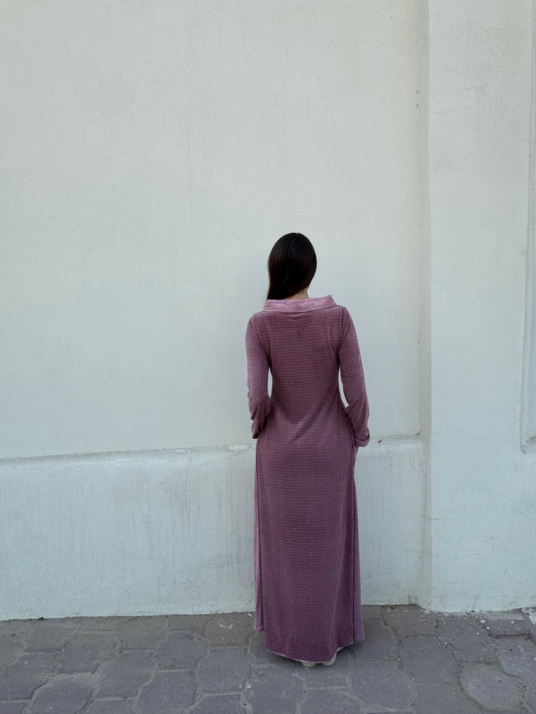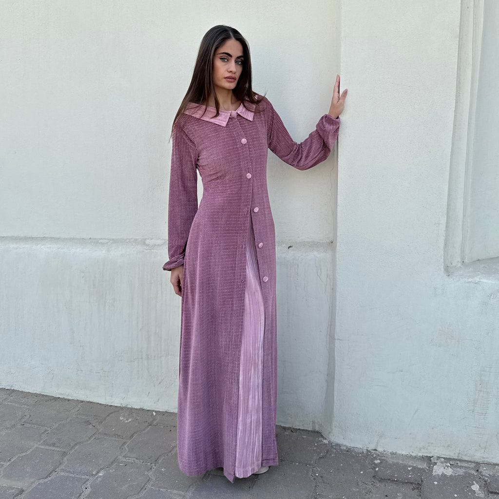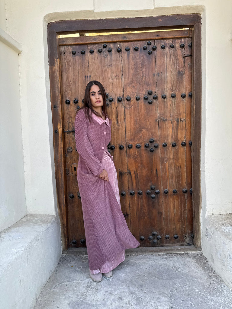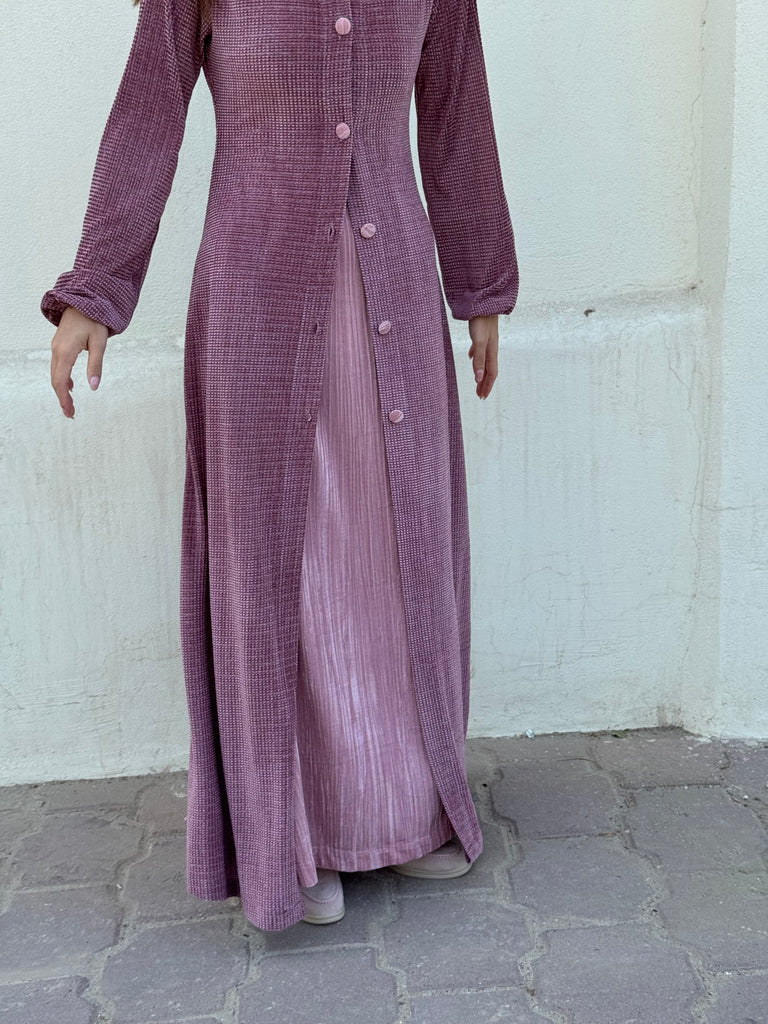 2 piece set includes a dress and bisht. Model is wearing size XS. Length is 55".