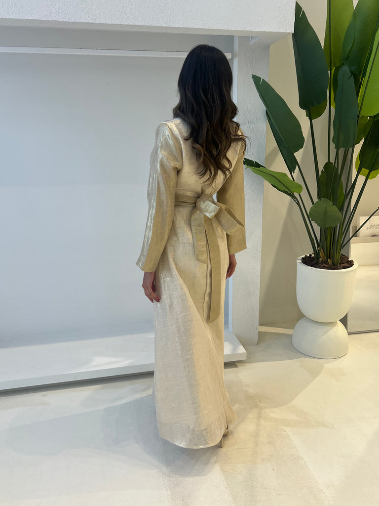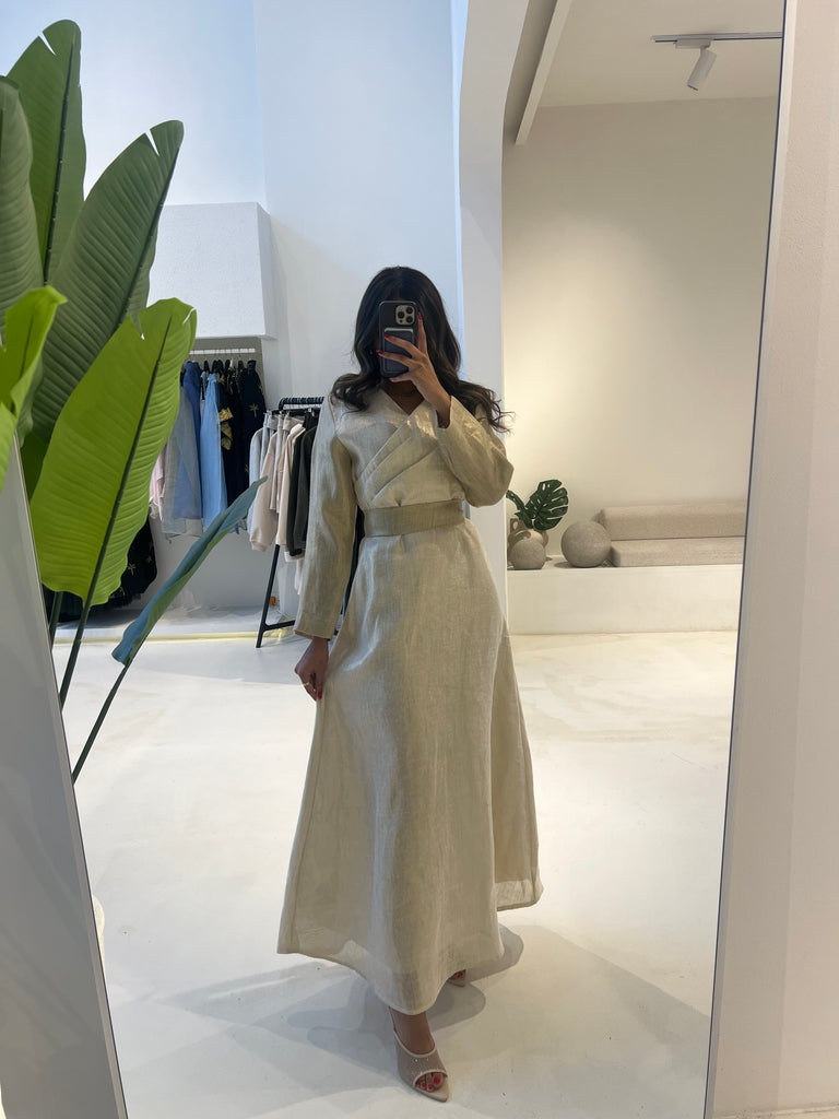 pleated neckline with an adjustable belt. length is 54". model is wearing size S-M.